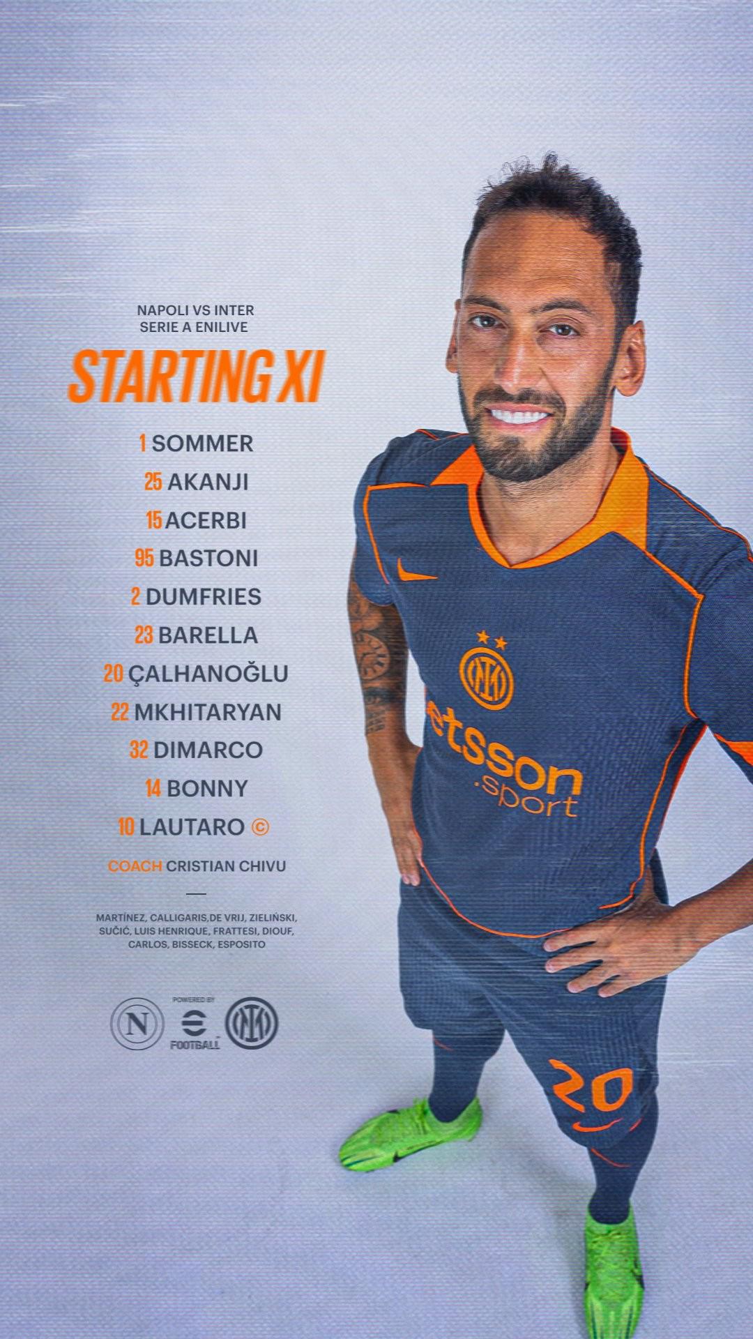 国米首发: 1-索默、25-阿坎吉、15-阿切尔比、95-巴斯托尼、2-邓弗里斯、23-巴雷拉、20-恰尔汗奥卢、22-姆希塔良、32-迪马尔科、14-博尼、10-劳塔罗